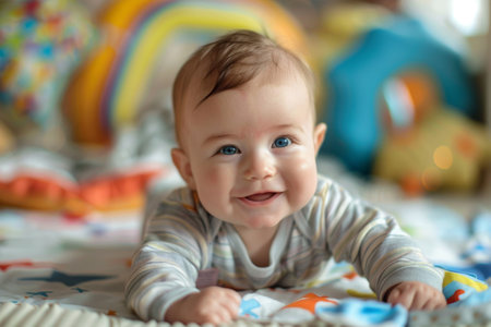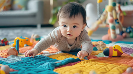 Adorable infant exploring toys on a colorful play mat in a nursery room