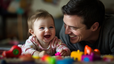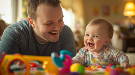 Father and baby share joyful moment playing with colorful toys at home during the afternoon