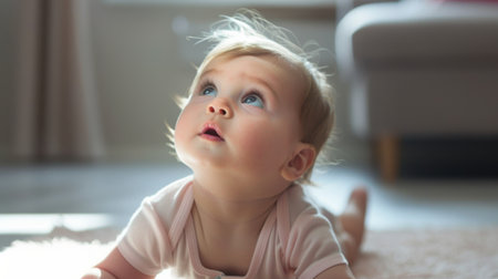 A delightful image of a baby gazing upwards with wide blue eyes, captured in soft natural light, radiating innocence and curiosity in a serene home setting.
