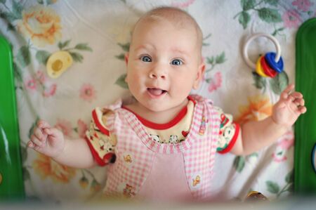 .7 month old baby girl on the bed looking at the camera
