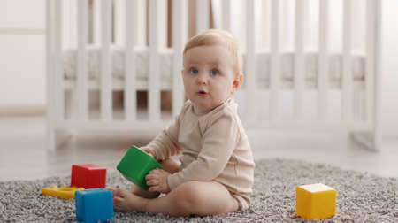 Little curious baby playing with colorful cubes, sitting on floor at bedroom , looking upward with interest, panorama