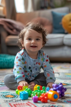 A joyful baby sits on a soft surface, surrounded by colorful building blocks, radiating happiness and curiosity in a bright, playful room filled with toys.