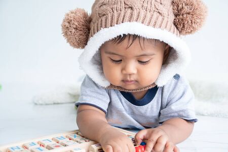 cute little asian baby boy playing with wooden toy