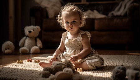 A baby girl sitting on a floor with colorful toys, AI
