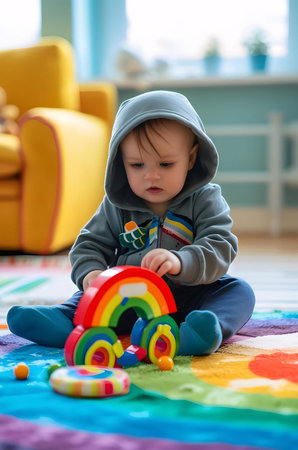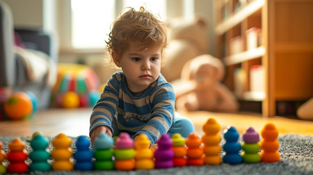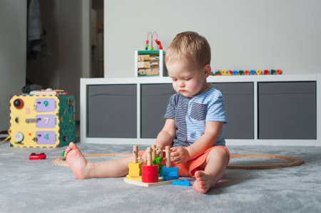 Toddler boy plays in playroom with educational toys...