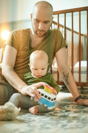 Man playing with baby on nursery floor, new dad and infant bonding with toys in bedroom at home. Family, love and development, young father and child development, teaching and learning with fun toy.