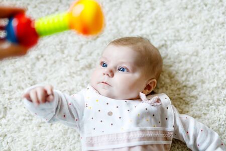 Cute baby girl playing with colorful rattle toy
