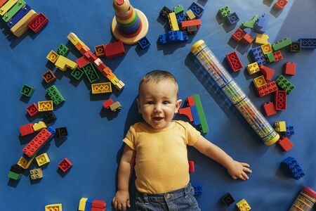 Happy baby playing with toy blocks in the kindergarten.