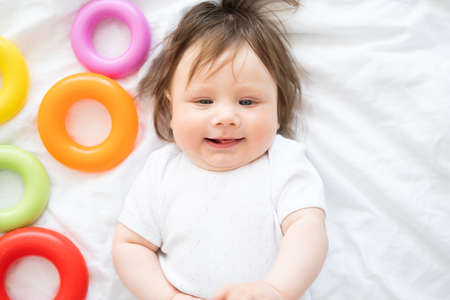 healthy baby boy lying on bed and play with colorful plastic circle toy