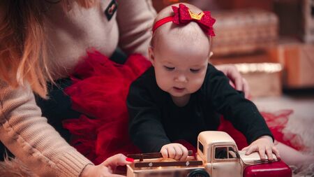 Christmas decorated studio - baby playing with a toy car
