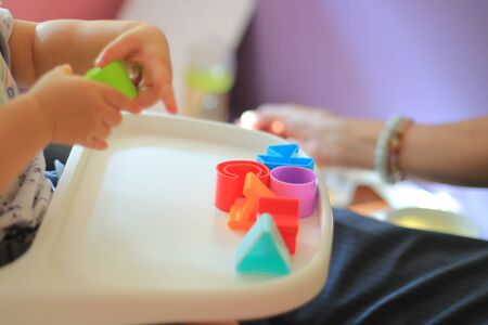 baby playing colorful toy while being fed by parent. plastic toy on baby dinning table.
