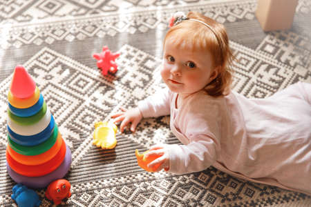 Red hair baby on the floor. Child laying on the carpet at home and playing with toys. Portrait of the cute infant girl. Colorful toys and a pyramid on the floor.