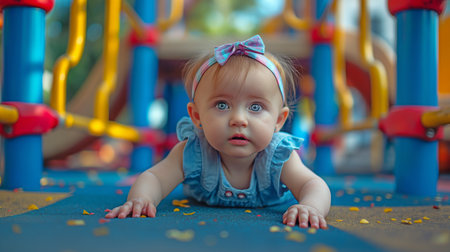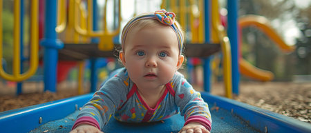 A curious infant crawls off to investigate from a children's playground.