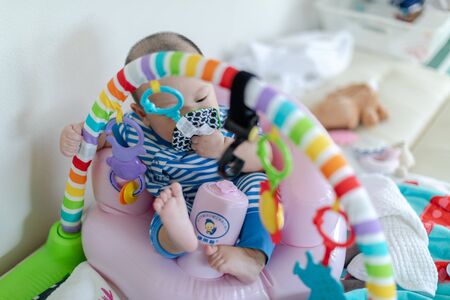 A cute young baby playing inside home with colorful toys