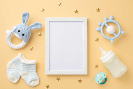 baby accessories concept. Top view photo of photo frame knitted bunny rattle toy blue teether milk bottle tiny socks baby's dummy and gold stars on isolated pastel beige background with blank space