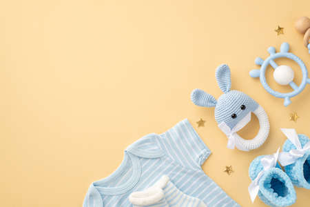 baby boy concept. Top view photo of blue infant clothes bodysuit socks shoes knitted bunny rattle toy teether and gold stars on isolated pastel beige background with copyspace