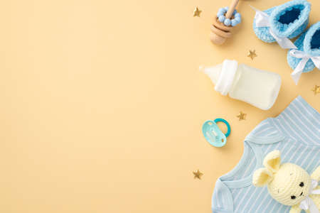 baby accessories concept. Top view vertical photo of blue shirt knitted booties milk bottle wooden rattle soother knitted bunny toy and gold stars on isolated pastel beige background with empty space