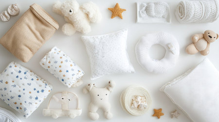 Top view of baby bedding and crib accessories, neatly arranged with ample copy space on a plain backdrop.