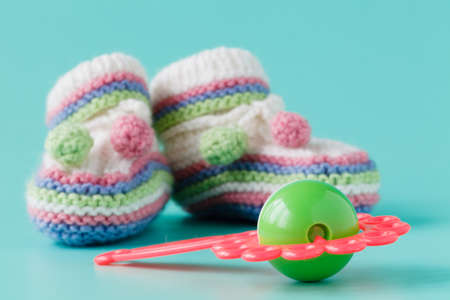 Newborn announcement concept. Knitted booties on aquamarine background