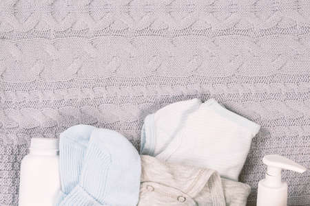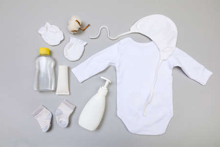 Set of clothing and body care supplies for newborns. Collect the bag in the maternity hospital. Accessories for baby care. Top view