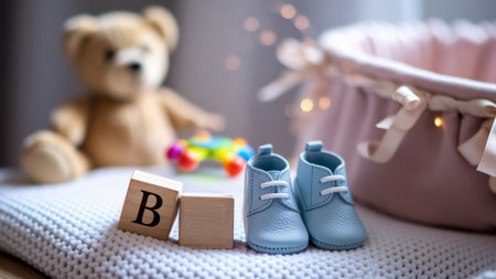 Blue baby shoes rest on a knitted blanket beside wooden blocks and a plush teddy in a softly lit nursery scene. Soft blurred background provides copyspace and empty area for text or graphic placement for baby announcements