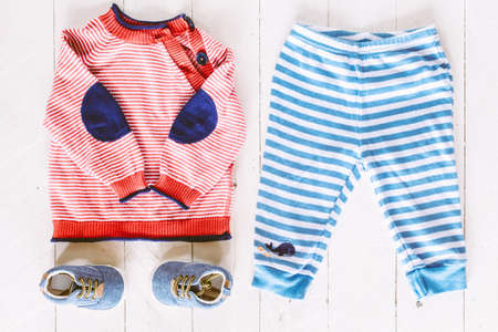 Children clothing on wooden background