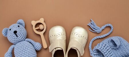 Flat lay banner with baby accessories set: crib shoes, teddy bear toy, knitted hat, wooden rattle and copy space.