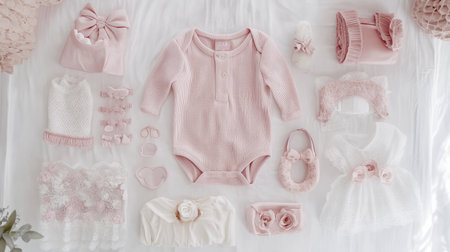 A flat lay of rose-colored baby clothes and accessories arranged neatly on a white bedspread