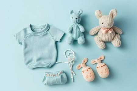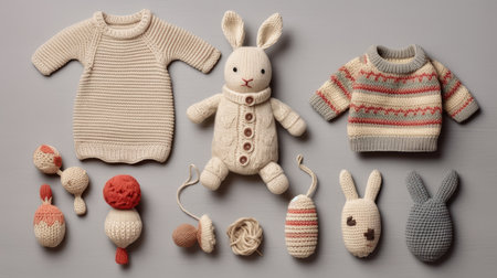 knitted baby toys and clothes, flat lay, AI Generated