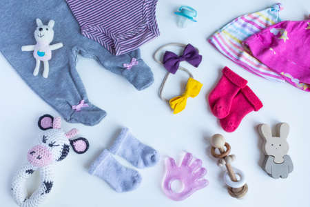 Stack of baby clothers and toys. Set of baby accessories, close up