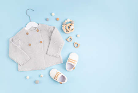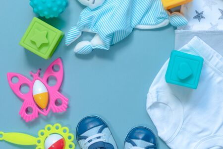 Baby clothes and toys on a blue background. Flat lay, top view.