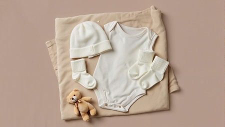 Top view of baby clothing sets, arranged symmetrically with ample copy space on a neutral backdrop.