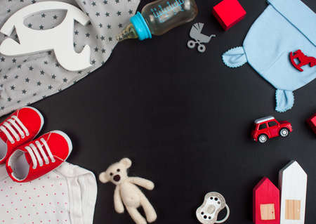 Baby shower concept. Newborn baby clothing and accessories on black chalk board background with blank space for text. Top view, flat lay.