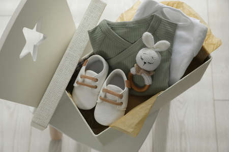 Box with baby clothes, shoes and toy on chair indoors, above view