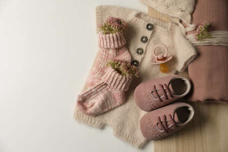 Baby clothes, shoes and accessories on light background, flat lay. Space for text