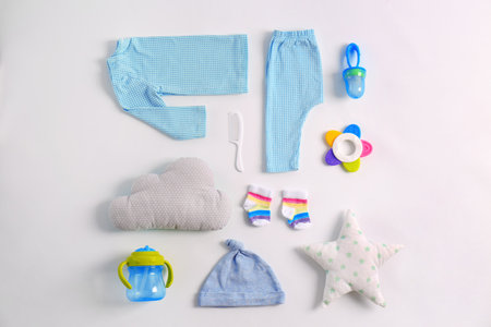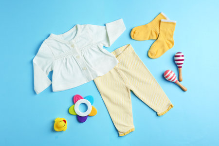 Baby clothes and toys on light background