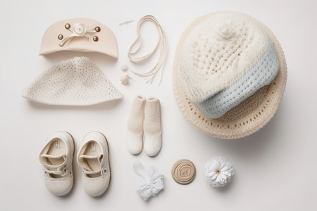 Newborn clothes and accessories over white background layout. Generative AI illustration