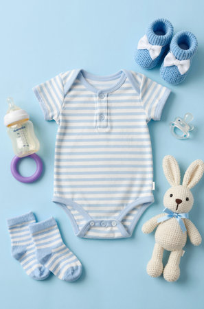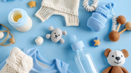 A delightful arrangement of baby essentials on a serene blue background featuring clothing, toys, and accessories perfect for new parents and infants.