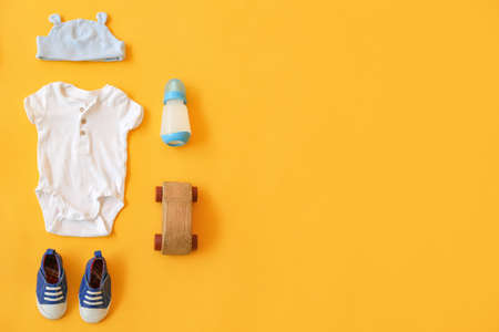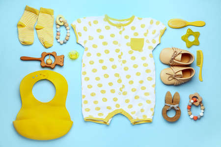 Flat lay composition with cute clothes on color background. baby accessories