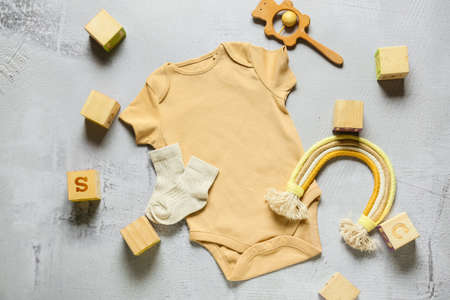 Kids toys and items. Flat lay of bodysuit with accessories for baby boy