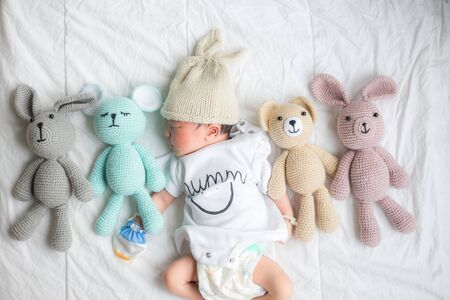 Cute infant baby boy sleeping on white blanket with teddy doll