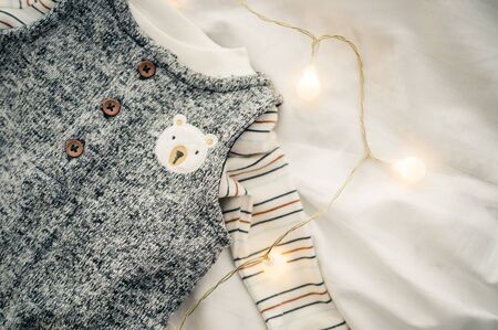 close up gray children's costume and sneakers for a newborn baby. parents expect baby's birth . selective focus .