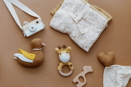 Bib and wooden toys. Set of baby stuff and accessories for newborn on brown background. Baby shower or baby care concept. Fashion newborn. Flat lay, top view