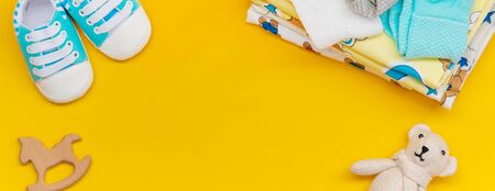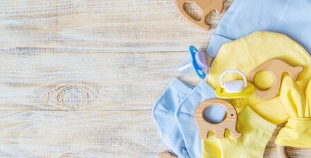 Baby clothes and toys abstract background with a copy space.