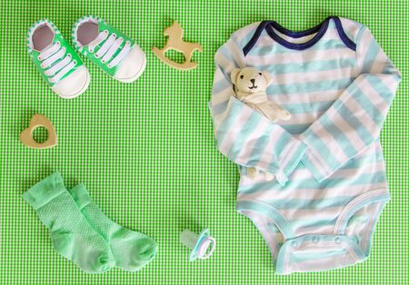 Baby accessories background: baby jumpsuit, socks, soother and toys over green background with copy space top view, flat lay