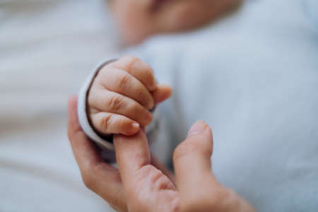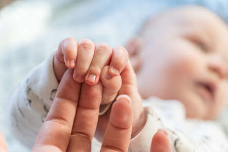 The newborn is holding a finger of mother on a white sheet bed background. A baby boy squeezes a finger of parent. Family and home concept