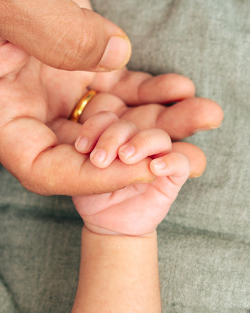 Baby fingers curl around parent hand, intimate moment of trust and love captured close-up