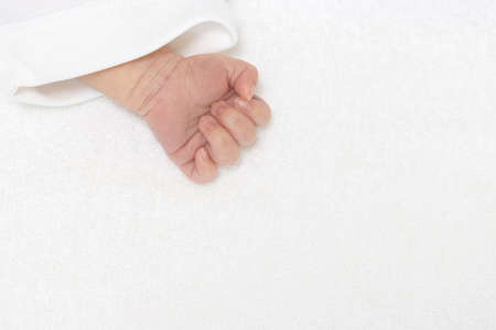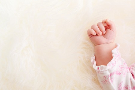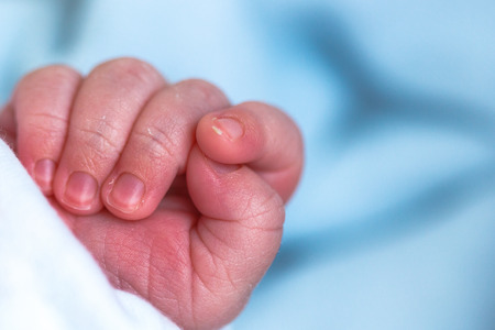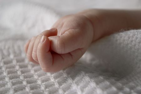 Hand of new born baby on a white blanket