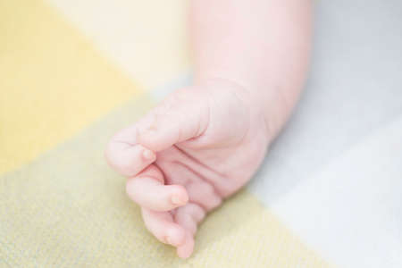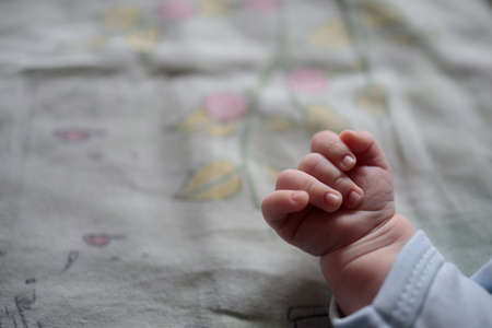 Infant baby boy hand close up, shallow depth of field photo only his finger in focus. Abstract motherhood background