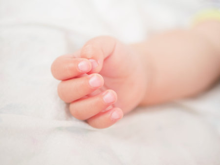 Newborn baby hand on white bed